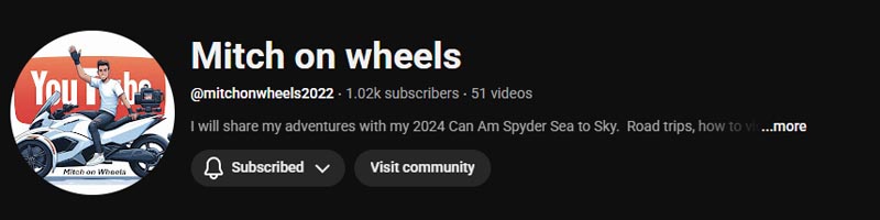 Based in the USA, this is a personal vlog mostly about the experience of a Can‑Am Spyder owner (Mitch), featuring some trips, tips, and reports of problems and solutions he has encountered.