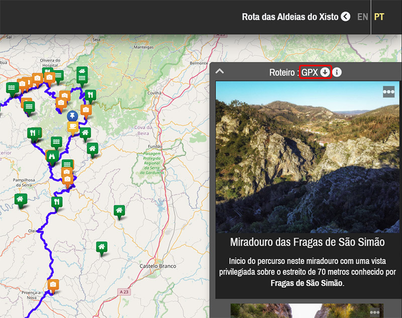 At the top of the sidebar of points of interest for each route (map), the itinerary file is available for download.