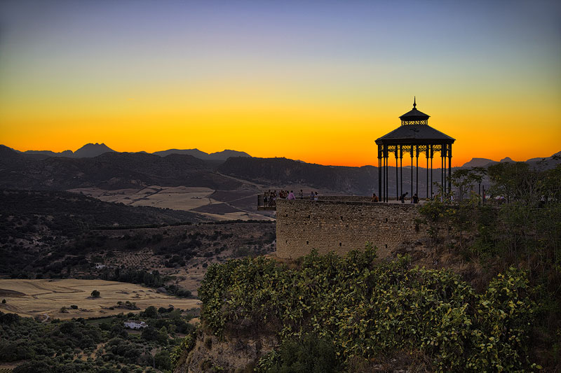 The western part of the alameda leads to the beautiful Paseo de los Ingleses, which runs along the edge of the Tajo cliff, offering grand views from balconies overlooking the Serranía de Ronda. In summer the sun sets behind the hills of the mountains. Watching this spectacle from one of these balconies is a memorable experience. To the south, next to the Bullring, is the garden of Blas Infante. Here you can see sculptures of Ernest Hemingway, Orson Welles, and the Japanese painter Miki Haruta, in homage to these individuals who fell in love with this city. After the garden and before reaching the magnificent Parador de Ronda, there is the viewpoint of La Sevillana (also known as del Coño! viewpoint). A pleasant space composed of a bandstand and an impressive metal balcony suspended over the precipice. A much‑appreciated place to spend an afternoon.