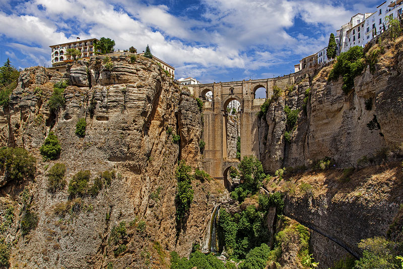 In 1735 the first bridge was built (with a single arch of 115ft/35m), which due to poor design collapsed six years later. Only in 1751 were the works restarted, being inaugurated 42 years later (1793). This time massive lateral supports (320ft/100m high) and a single arch of just 49ft/15m were used. Besides being spectacular, it is an important work as it connects the historic and modern areas of the city, spanning the impressive gorge carved by the Guadalevín River, known as el Tajo de Ronda. Inside the bridge, just below the deck, there is a space that today houses the Interpretation Center of the Environment and History of the City. During the civil war this place was used as a prison and supposed torture chamber, with even some unconfirmed stories indicating that prisoners were thrown from the bridge.