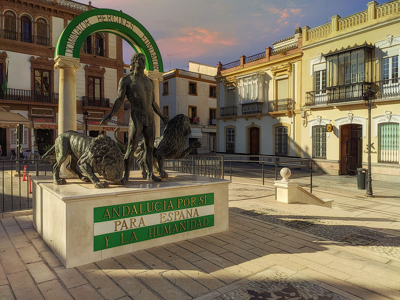 It had to be almost completely restored after the War of Independence against the French (early 19th century). It was at that time that the surrounding buildings appeared, such as the Casino de Ronda (or Círculo de Artistas). The Church of Socorro, which dominates the square, is of more recent construction (20th century), replacing an old hermitage. In the center there is a fountain with a monument to Hercules and a sculpture of Blas Infante, an important Andalusian figure.