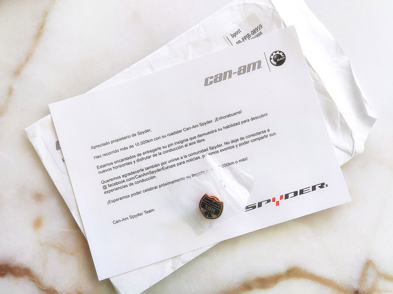 Uma nota rápida para o "Spyder Pin Program". Uma gentileza da marca que oferece aos seus clientes (mediante prova) um pin aos 10.000, 50.000 e 100.000 quilómetros... Pedimos o de 10 mil que é o único que nos assiste neste momento (embora já tenhamos passado o dobro). Achávamos que este programa não se aplicava a Portugal mas estávamos enganados, ao cabo de um mês e picos chegou a casa uma carta e a respectiva lembrança. Muito simpático da parte da BRP, mesmo que a carta nos chegue escrita em espanhol.