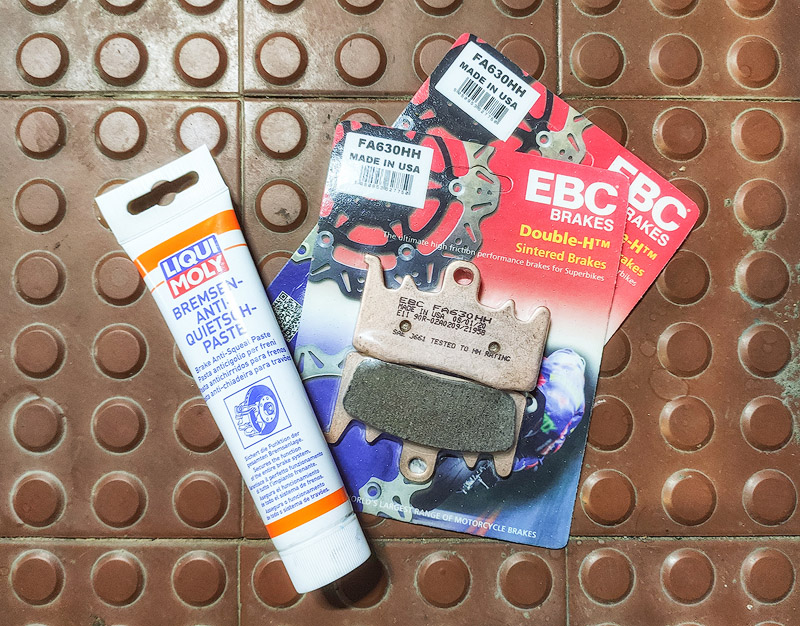 Estava quase a 1 milímetro mínimo à frente antes da nossa semana de Agosto pelo Norte, pelo que decidi que seria melhor trocar as pastilhas à frente (com mais ou menos 22 mil quilómetros). A Benimoto estava fechada para férias de modo que resolvi meter mãos-à-obra e aproveitei também para experimentar um jogo de pastilhas diferentes das originais, as EBC muito populares e recomendadas por vários. Totalmente sinterizadas (e não orgânicas) têm melhor desempenho nas mais variadas condições de chuva ou alta temperatura. A troca foi rápida, o maior trabalho está em levantar a Spyder do chão e retirar as rodas. Aproveitei também para usar uma pasta própria para eliminar os guinchos de travão que se ouvem normalmente em dias de calor (e até ver parece que funciona) e que se coloca entre a pastilha e o êmbolo.