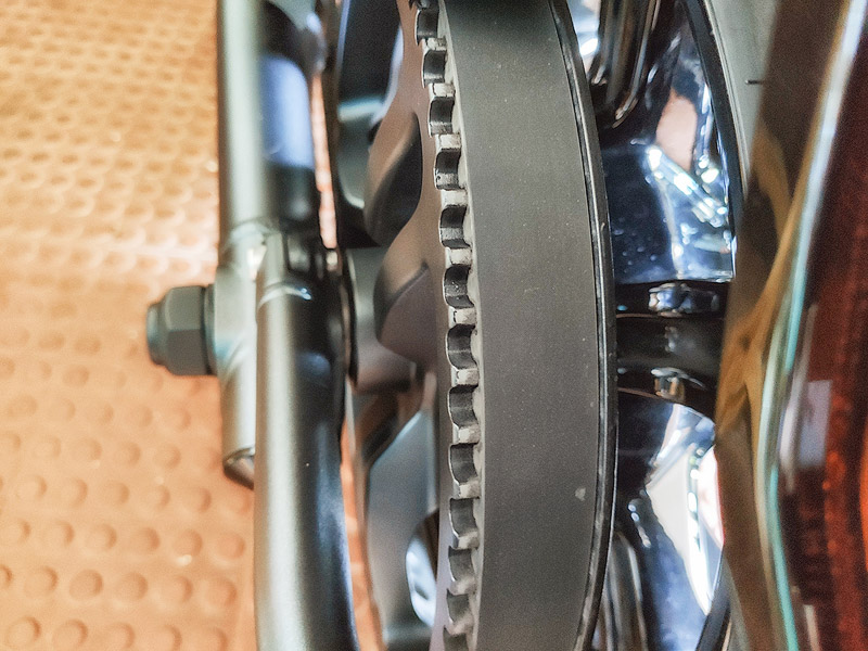 Já em casa, com o pneu trocado, reparei que a correia andava um pouco "por todo o lado", quando deveria estar encostada ou a não mais de 1 milímetro do interior da cremalheira traseira. Estava claramente desalinhada, resultado de ter sido mexido o eixo.