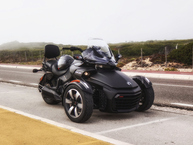 Foi aí que procurei opções mais capazes para viajar a dois. Depois de considerar o que havia no mercado de duas rodas, foquei-me na RT proposta pela BMW. Mas cheguei à conclusão que este grande cruzador cheio de conforto e electrónica sofre dos mesmos males. Um bicho bem pesado (mais ainda que a Tiger), curiosamente com uma altura de banco significativa que a torna ainda mais difícil de manobrar. Então, já não sei bem como, lembrei-me da Spyder. Na verdade em toda a minha vida devo ter visto duas ou três, há vários anos. Aquele conceito de duas rodas à frente merecia ser visto.